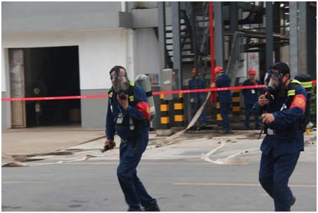 搶險小組穿戴重型(A級)防化服和空氣呼吸器進(jìn)入現(xiàn)場搶修